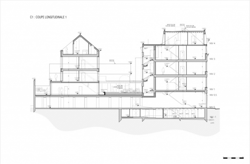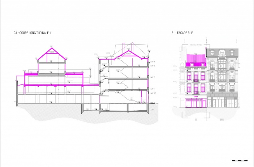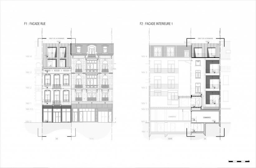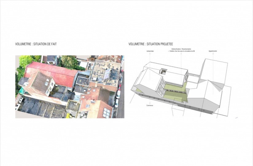 Le bâtiment arrière est quant à lui réaménagé en un logement unifamilial composé de 5 chambres sur 4 niveaux.La maison individuelle en coeur d’îlot s’élève sur quatre niveaux, accueille cinq chambres – chacune dotée d’une salle de douche – et se distingue par quatre grandes terrasses, deux adjacentes à l’espace de vie principal du niveau bas et une tropézienne créée sur le toit grâce à une toiture entièrement refaite et isolée par l’extérieur.Le rez-de-chaussée dans son ensemble reste affecté en commerce avec une surface totale de 276 m2 et partage les accès de service et évacuation de secours.Enfin, le sous-sol est redistribué en surface de stockage pour le commerce, de caves privatives pour les 5 logements et de deux locaux vélos permettant de garer 12 vélos (5 + 7) soit 1 vélo par chambre, conformément au RRU.Il n’est pas prévu d’aménager des emplacements de parkings pour véhicules qui seraient réservés aux futurs occupants des logements de l’immeuble et/ou pour le commerce.