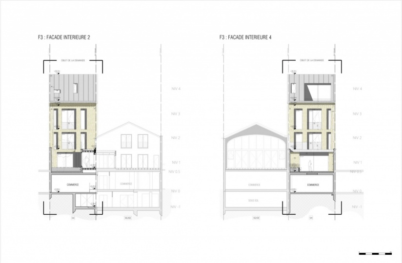 À l’intérieur, le commerce existant (magasin de vêtements) occupe de façon continue l’ensemble du rez-de-chaussée ainsi que plusieurs niveaux, depuis la façade sur rue jusqu’au fond de parcelle.Avec le temps, des annexes ont été ajoutées entre les bâtiments avant et arrière, effaçant la distinction originelle entre les deux corps de bâti.Aujourd’hui, cette séparation est quasiment imperceptible de l’intérieur. Le commerce se déploie ainsi sur plusieurs étages de l’ensemble, tandis que les niveaux supérieurs de chaque bâtiment accueillent encore quelques unités de logement.Cependant, ces logements ne répondent pas aux normes réglementaires attendues : ils sont accessibles uniquement en traversant les espaces commerciaux, et présentent des surfaces et des apports de lumière naturelle insuffisants pour garantir des conditions d’habitation conformes et souhaités par les exigences actuelles.